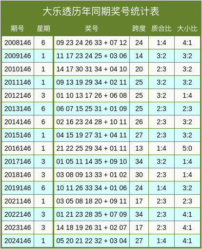 上期开奖号码的前区跨度为20,大小比为3:2,质合比为2:3。