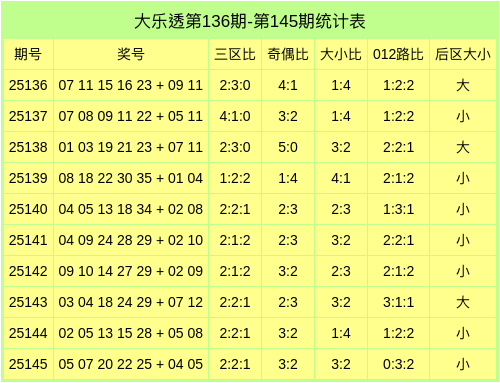 前区奖号大小比为3:2,奇偶比为3:2,012路比为0:3:2,后区开出“少量+少量”组合号码。